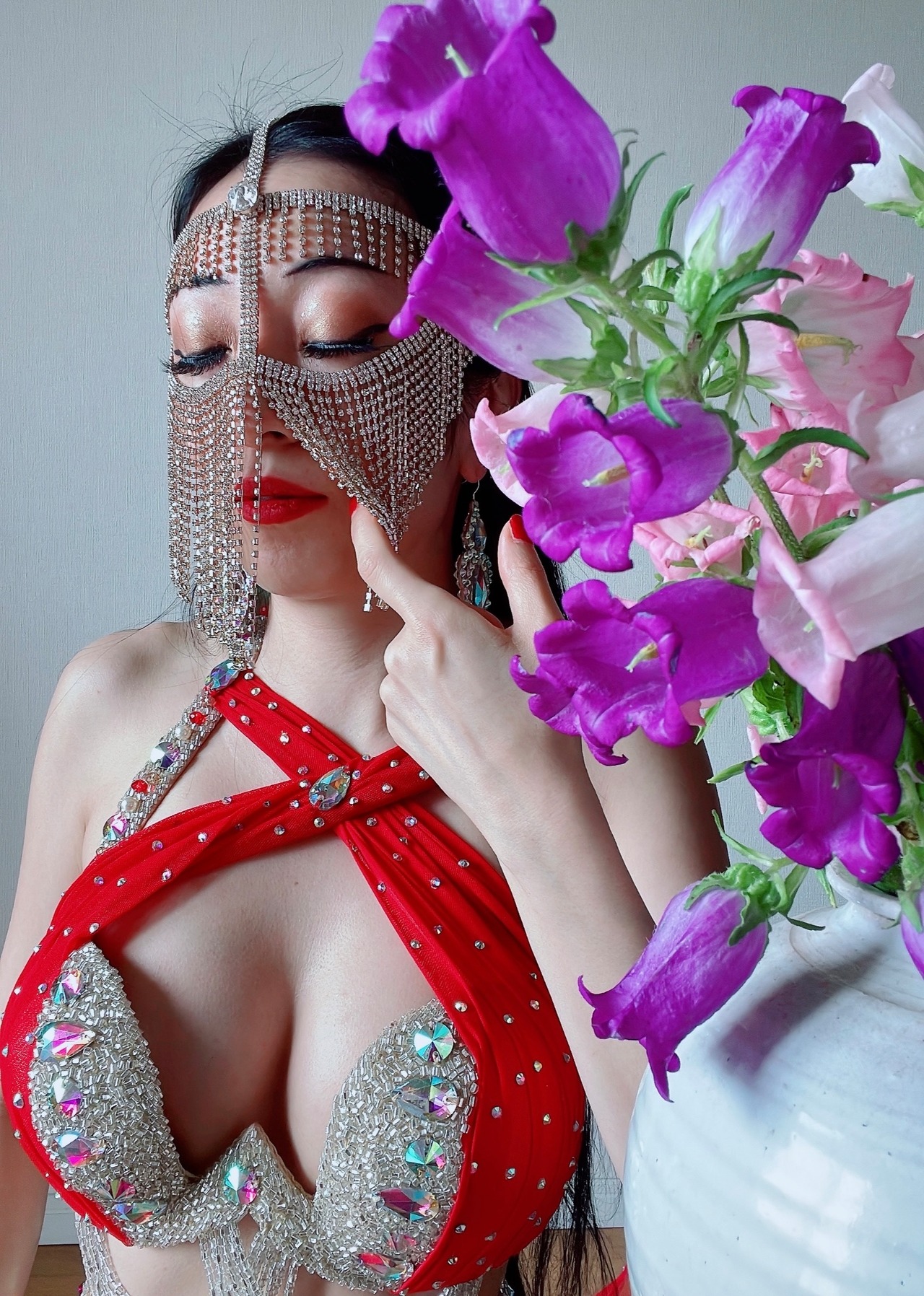 装着することで、踊り手の表情を神秘的に隠し、観客の想像力をかき立てます。まるで千夜一夜の物語の一場面のような、幻想的な雰囲気を演出します。