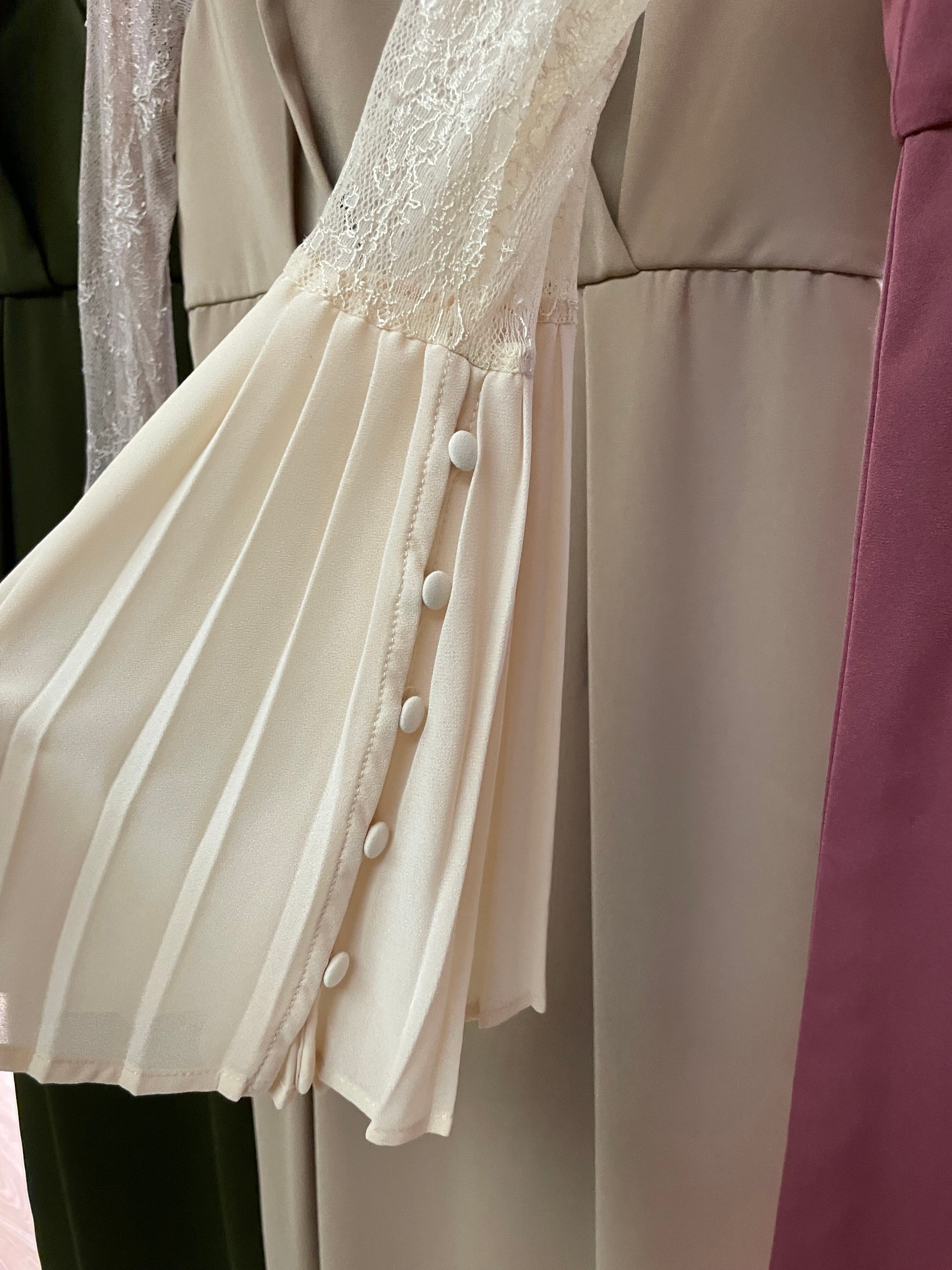 ドラマティックなベルスリーブは、くるみボタンを外せば、瞬時にトレンドのスリットへと変貌し、あなたの動きに詩的な躍動を与えます。
