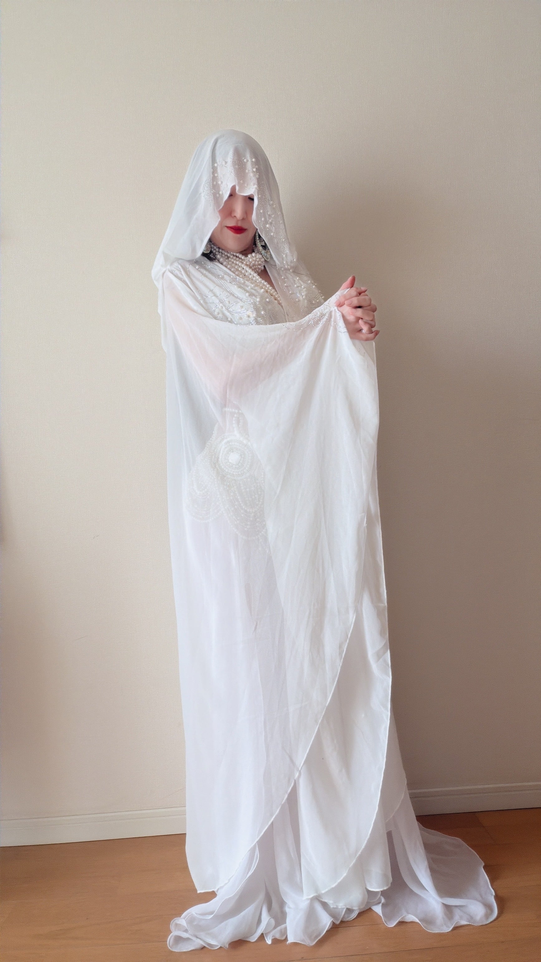 ベリーダンスの幕開けに欠かせないこの一着は、踊りの前に肌を優美に隠し、神秘的な雰囲気をまとわせるアイテム。