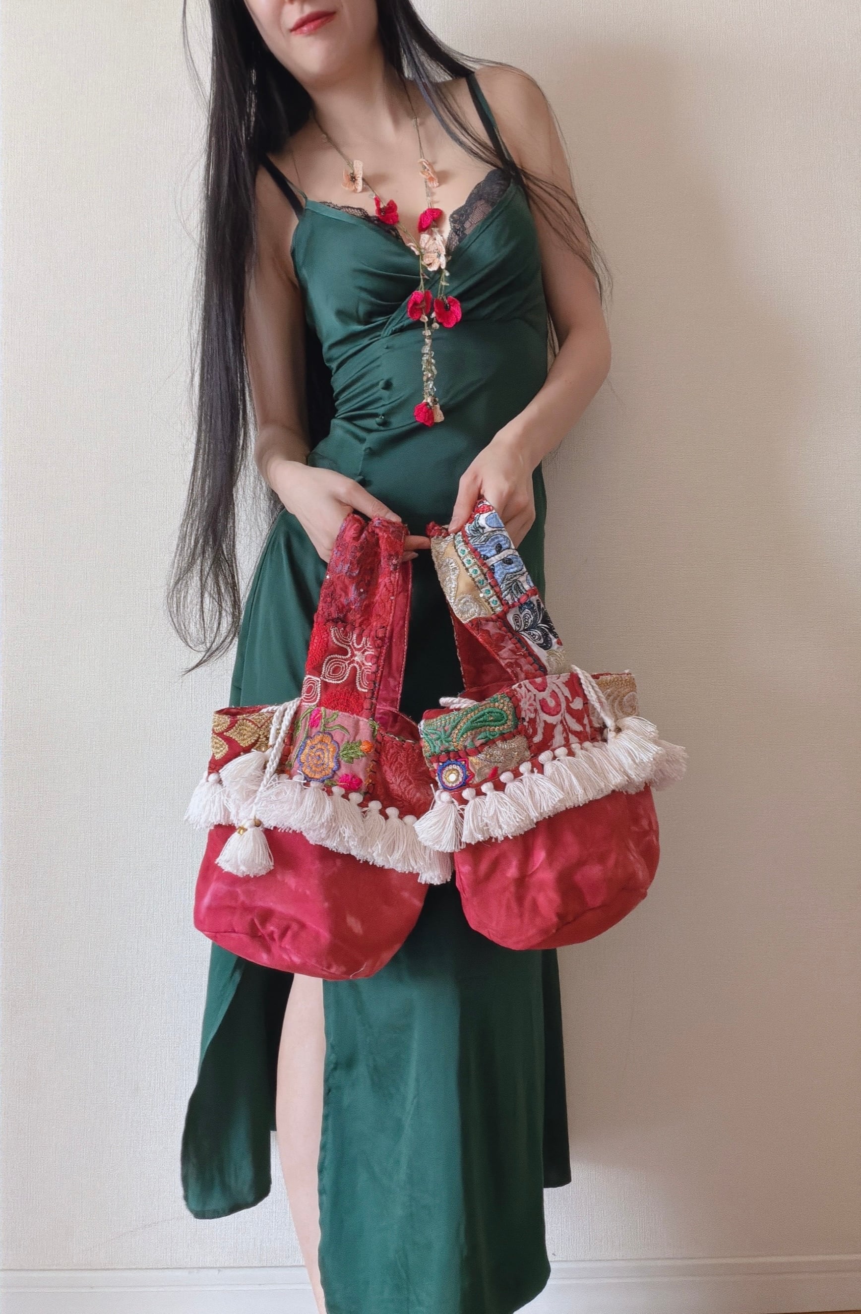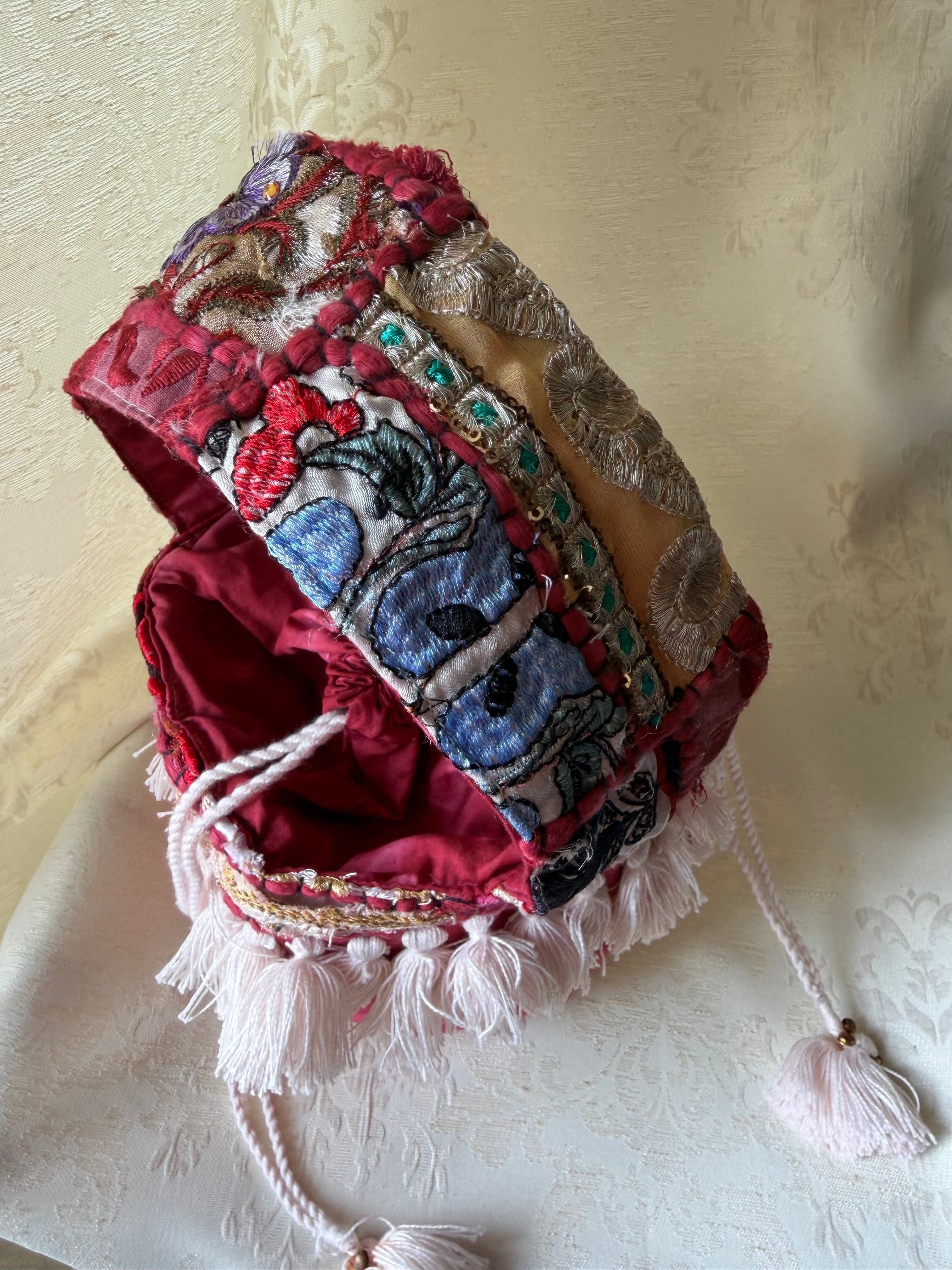 インドの古布にフリンジ、鈴など装飾が贅沢なシリーズ。オンリーワンの布の組み合わせが楽しい。